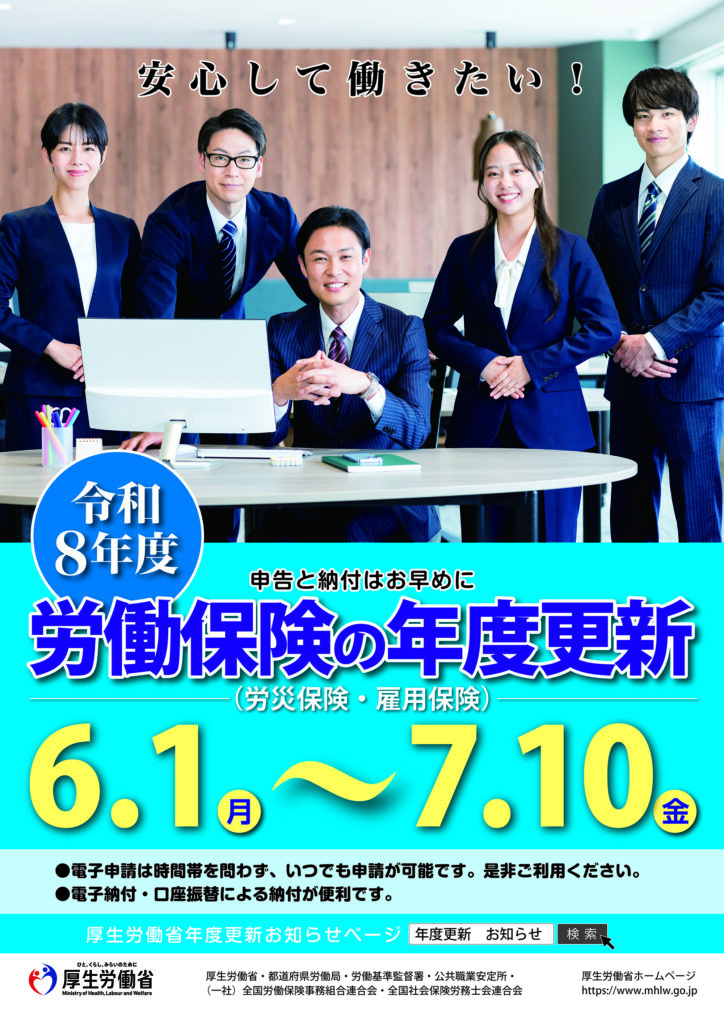 令和8年度労働保険の年度更新期間は6月1日(月)~7月10日(金)です。