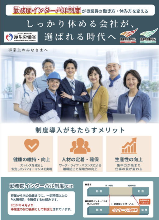 「勤務間インターバル制度」ポスター・リーフレット 公開日:2026年4月9日 勤務間インターバル制度についての周知ポスター・リーフレットを掲載しています。ご自由に印刷の上、周知等にご活用ください。また、リーフレットには、制度導入についての概要を記載していますので、ぜひご覧ください。 資料のダウンロード | 勤務間インターバル制度とは | 働き方・休み方改善ポータルサイト ポスター リーフレット FacebookXHatena