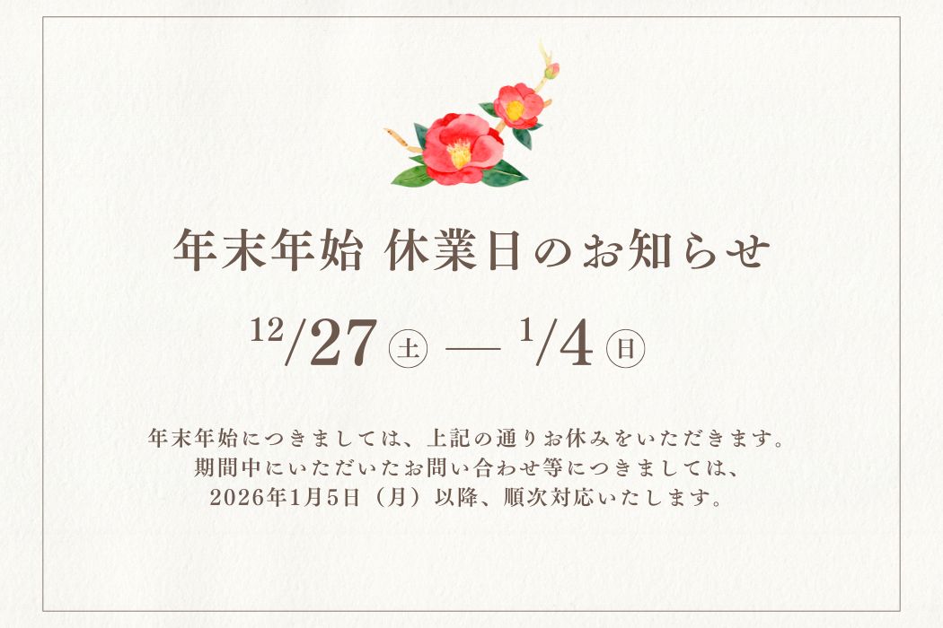 年末年始休業日のお知らせ 公開日:2025年12月2日 当事務所は、下記の期間を年末年始の休業日とさせていただきます。 休業期間:2025年12月27日(土)~2026年1月4日(日) 期間中にいただいたお問い合わせ等につきましては、2026年1月5日(月)以降、順次対応いた […] 続きを読む